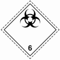 В нижней половине знака могут иметься надписи «Инфекционное вещество» и «В случае повреждения или утечки немедленно уведомить органы здравоохранения»). Символ (три полумесяца, наложенные на окружность) и надписи — черные. Фон — белый. Цифра «6» в нижнем углу.